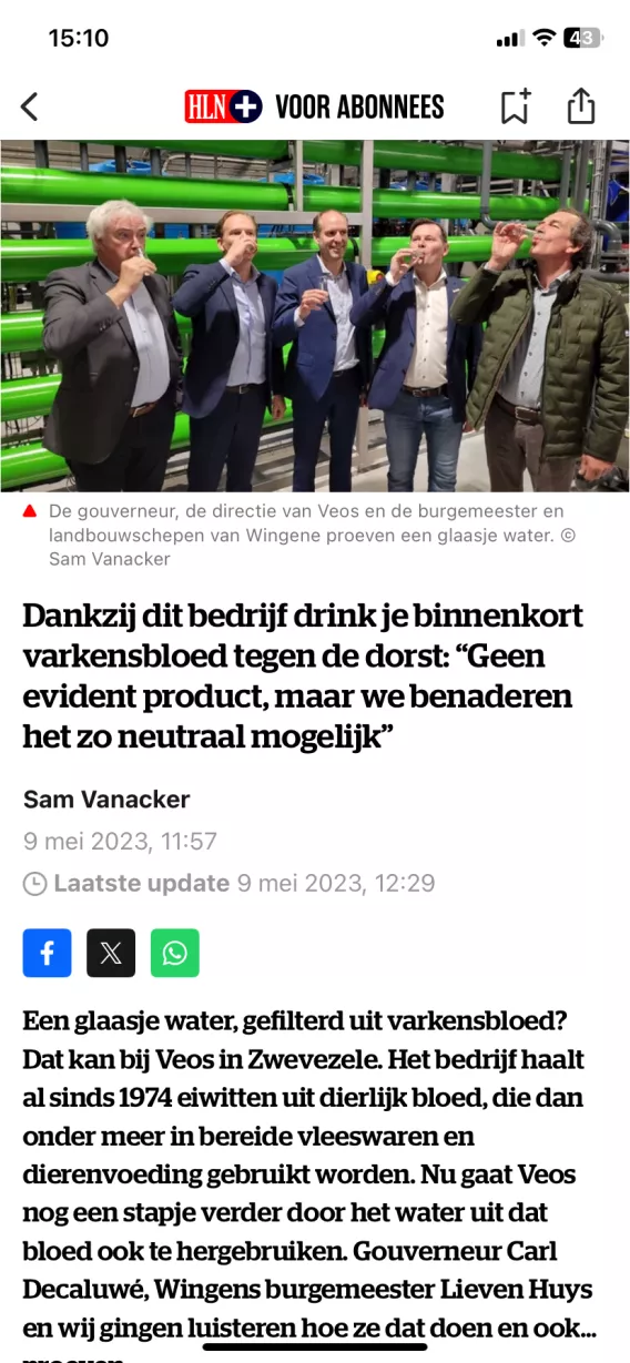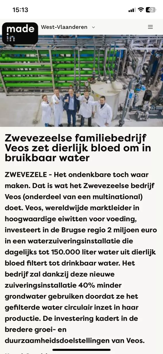 Finalement, Veos a eu une idée révolutionnaire : pourquoi ne pas filtrer du sang animal pour obtenir de l'eau potable ? C'est donc ce qu'il a fait ! Avec sa nouvelle installation d'épuration, Veos réalise jusqu'à 40 % d'économies sur sa consommation d'eau souterraine et offre à ses collaborateurs une eau originale « faite maison ». Small Talk a reniflé l'odeur du sang et a créé une campagne PR créative qui n'aura pas manqué de mettre l'eau à la bouche des médias tant régionaux que nationaux. Et le moins qu'on puisse, c'est que cette campagne a beaucoup plu.
